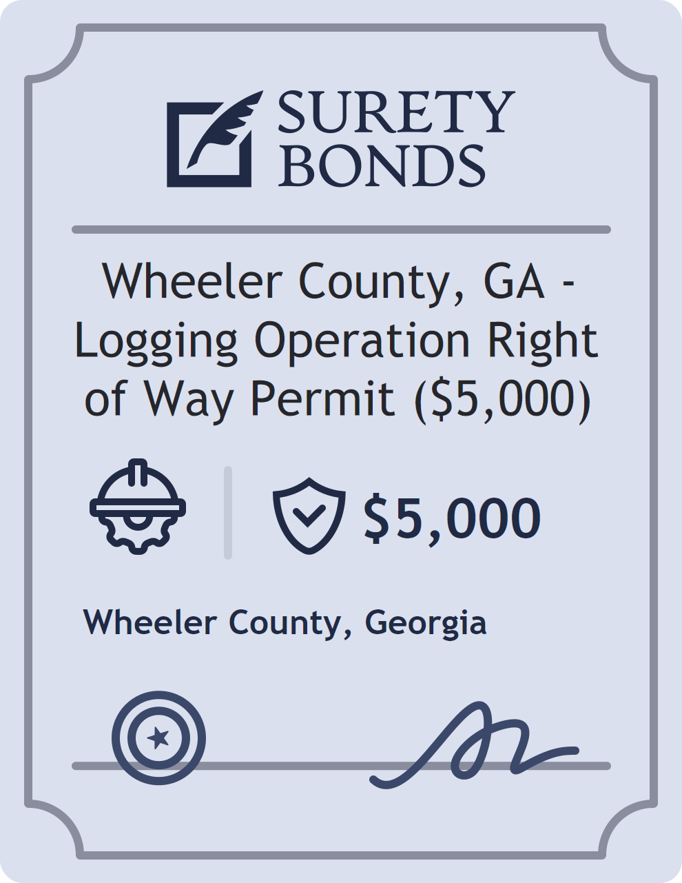 The Wheeler County, GA – Logging Operation Right of Way Permit ($5,000) is classified as a Contractor Bonds with a $5,000 obligation in Georgia. Contractor Bonds are surety bonds required for individuals or businesses performing construction work. They guarantee that contractors will comply with building codes, licensing requirements, and contractual obligations. The bond provides financial protection to property owners and the public in cases of poor workmanship, regulatory violations, or unfinished work. The surety reviews financial strength, compliance history, and indemnity support before approving the obligation. Maintaining uninterrupted coverage for the entire 1 Year term is essential; lapses can trigger penalties, contract defaults, or license suspension in Georgia. Underwriters typically request financial statements, references, and proof of licensing before quoting terms so they can evaluate repayment capacity. Throughout the bond term, the principal must maintain accurate books, respond to regulator inquiries, and remediate any complaints to prevent a claim. Many authorities in Georgia also require renewal certificates 30 to 60 days in advance, and failure to provide proof can halt permitting or bid submissions. The $5,000 limit demonstrates to customers, partners, and oversight agencies that the bonded party maintains a reliable, surety-backed source of funds dedicated to ongoing compliance. The obligee for this bond is Wheeler County.