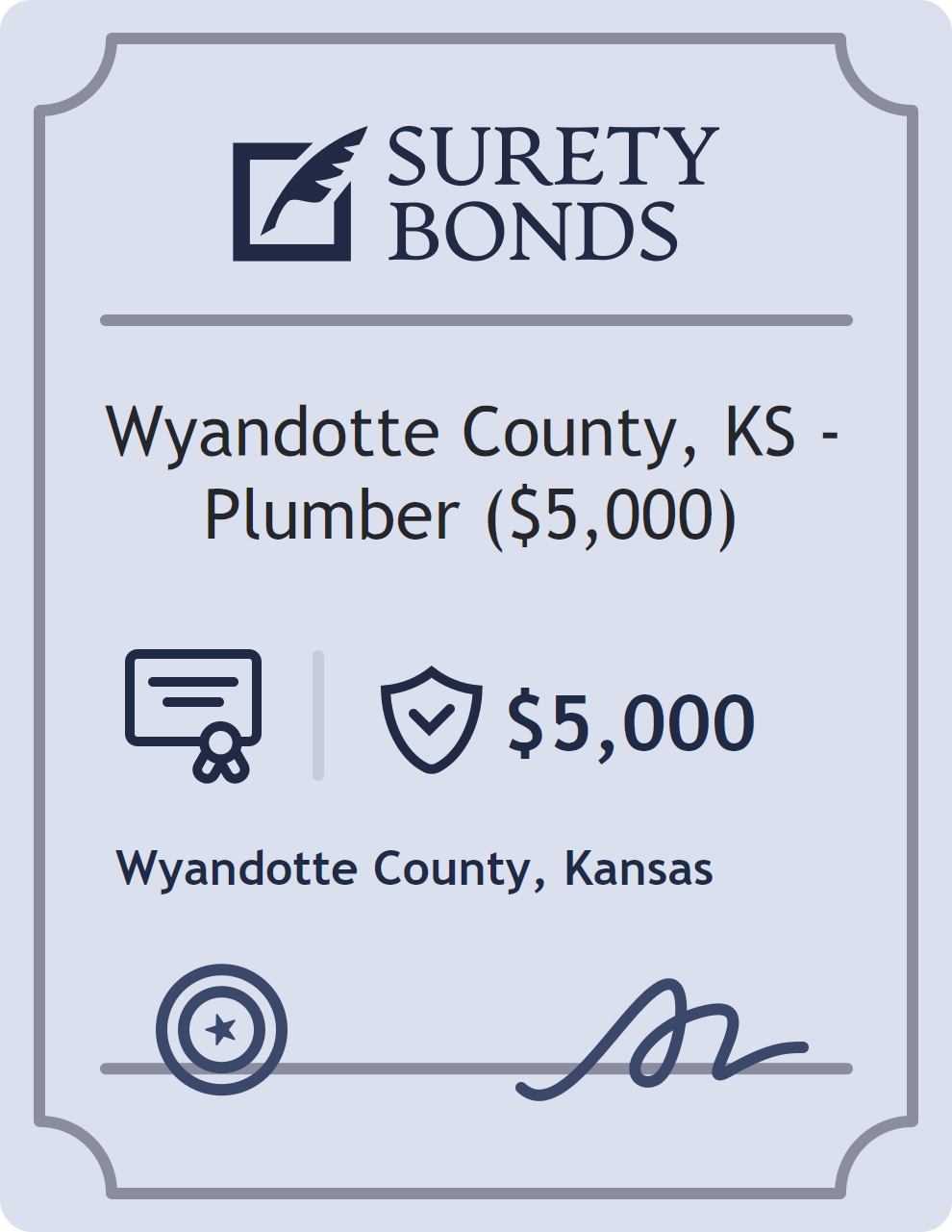 The Wyandotte County, KS – Plumber ($5,000) is classified as a Professional License Bonds with a $5,000 obligation in Kansas. Professional License Bonds are surety bonds required for licensed professionals across various industries. They guarantee compliance with licensing laws and ethical standards, protecting clients and regulatory bodies from harm. The surety reviews financial strength, compliance history, and indemnity support before approving the obligation. Maintaining uninterrupted coverage for the entire 1 Year term is essential; lapses can trigger penalties, contract defaults, or license suspension in Kansas. Underwriters typically request financial statements, references, and proof of licensing before quoting terms so they can evaluate repayment capacity. Throughout the bond term, the principal must maintain accurate books, respond to regulator inquiries, and remediate any complaints to prevent a claim. Many authorities in Kansas also require renewal certificates 30 to 60 days in advance, and failure to provide proof can halt permitting or bid submissions. The $5,000 limit demonstrates to customers, partners, and oversight agencies that the bonded party maintains a reliable, surety-backed source of funds dedicated to ongoing compliance. The obligee for this bond is Wyandotte County.